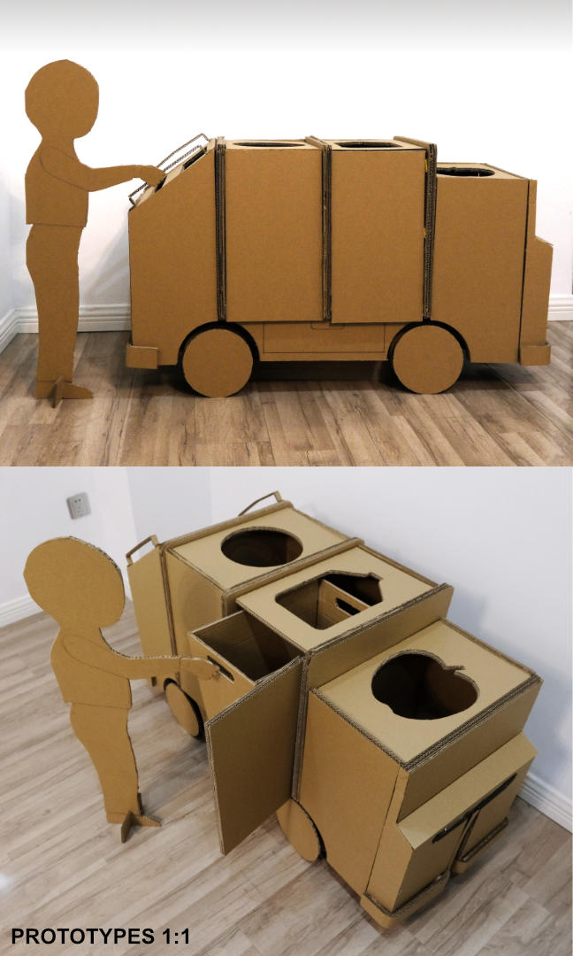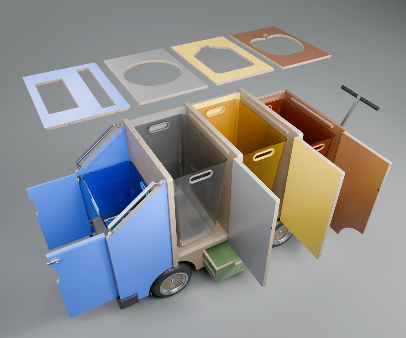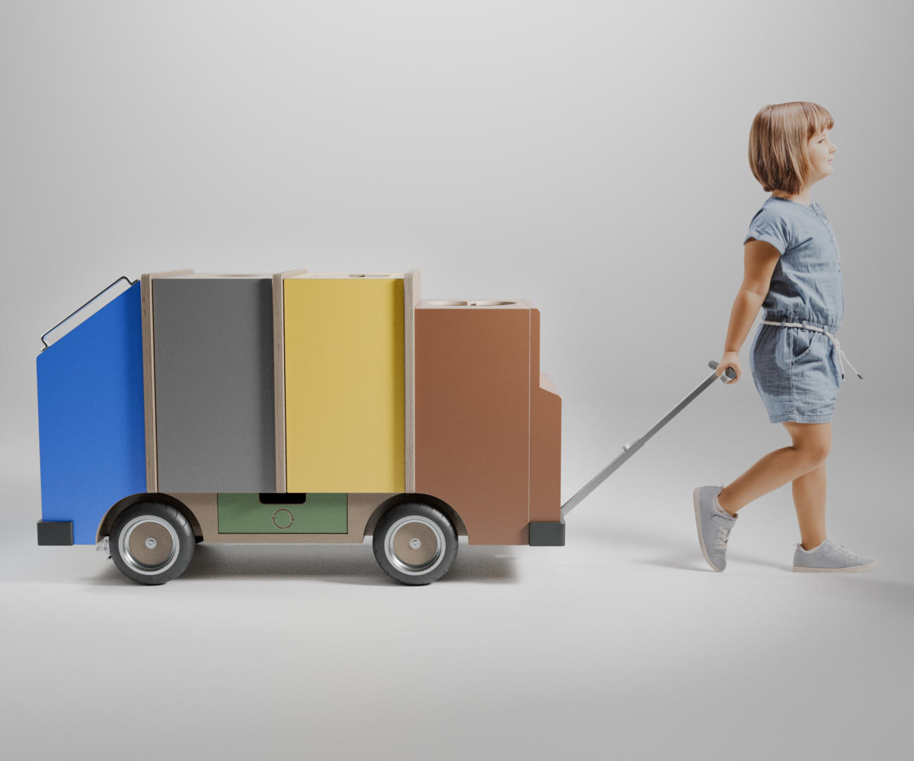 Shaped like a garbage truck, Garby contains five compartments for separating waste, represented by the colors of street containers. (Which differ among countries, this one is meant for Germany, Spain, France, Portugal and Poland.)