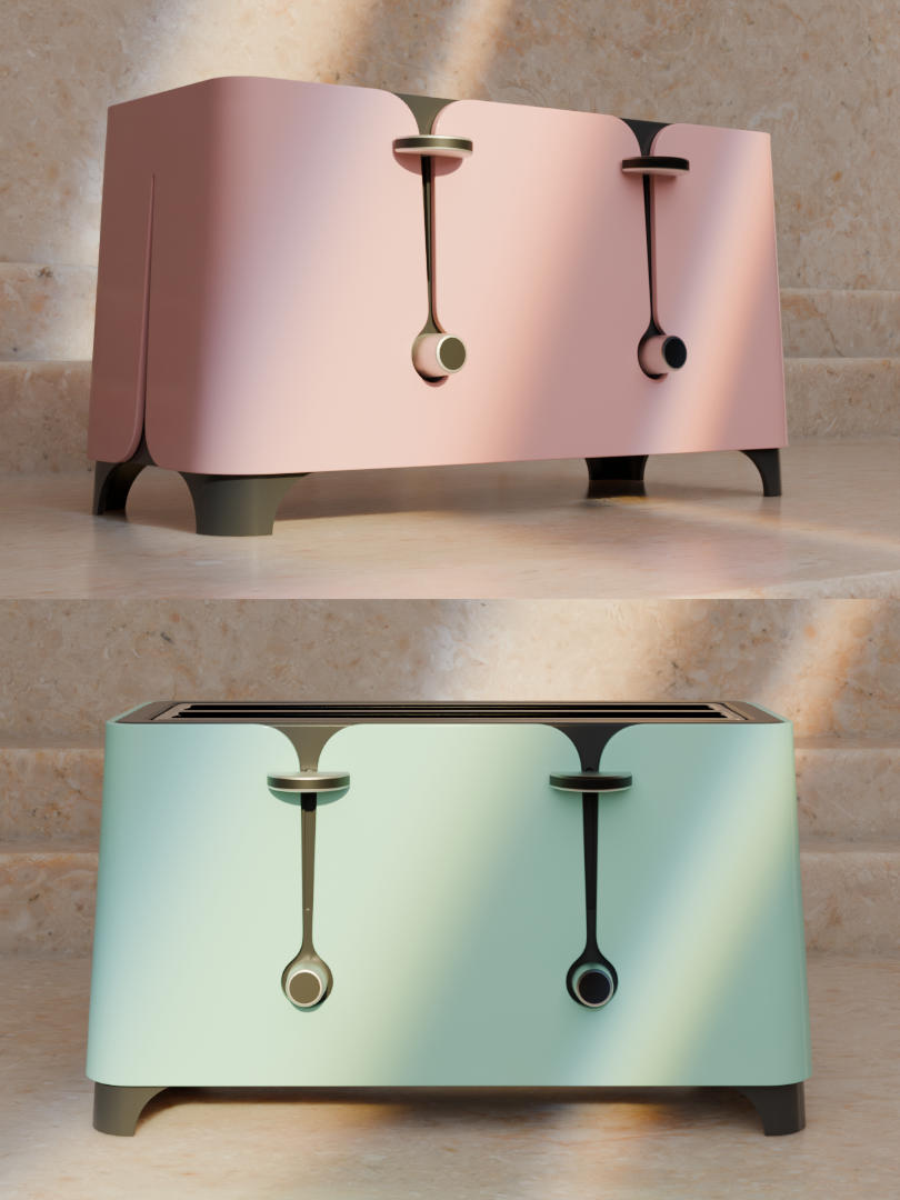 The jacket of this toaster in the ‘wood’ version is made of a heat-resistant composite wood (made of wood fibers and recycled plastic bottles).